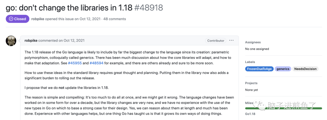 曾经在 Go1.18 时,Go 语言之父 @Rob Pike 冒了个泡,型库掌了舵,终于让不要这么急把泛型重写进标准库。加入怕太着急,速览对泛型不熟会翻车。过年