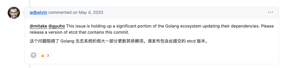 etcd 的这个历史问题已经存在了好几年,一直处理的慢慢吞吞。甚至影响到了 Go 生态圈的一些技术选型问题。