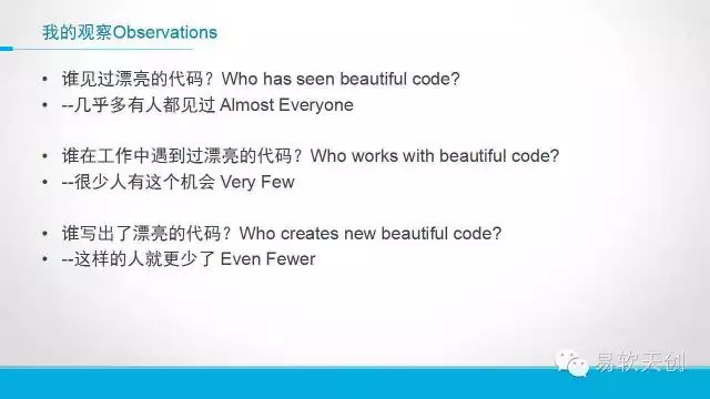 前面提到了我已经做了观察。我们都会观察。几乎每个人都看到过漂亮的代码。这些代码简洁明了,而且很强大。这种代码易于理解,易于使用,易于扩展。我们可以很快地完成工作,把事情做好。然而,如果我们问人们,他们是否在漂亮的代码基础上工作,大多数人说没有。那么,这个代码是从哪里来的呢?嗯,很少有开发人员能写出这些漂亮的